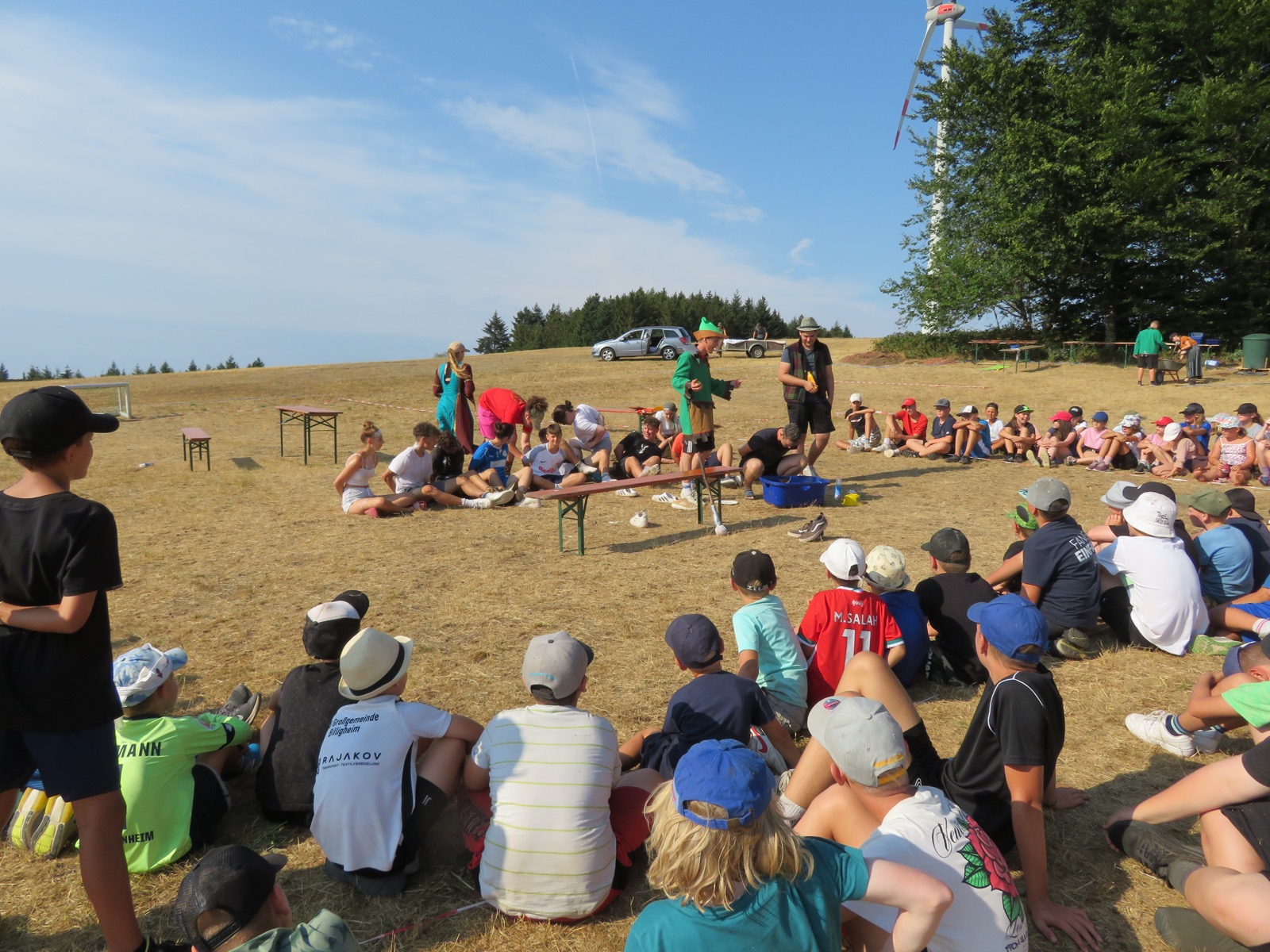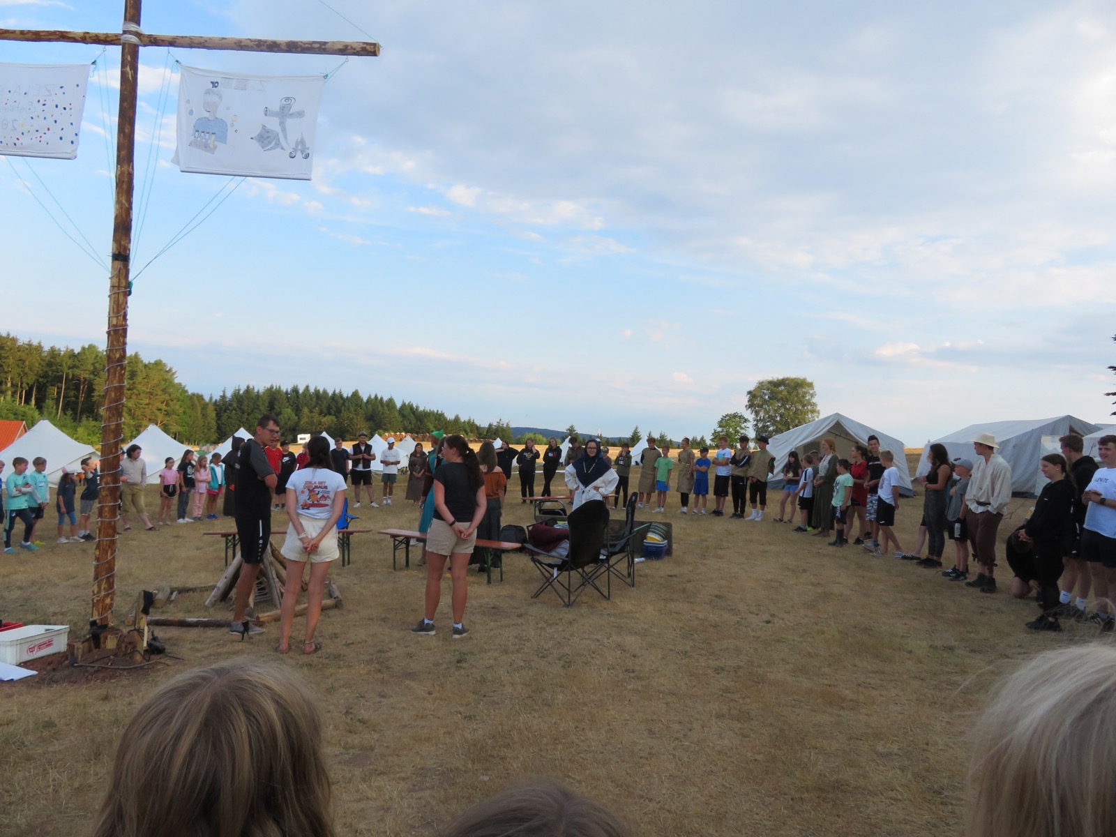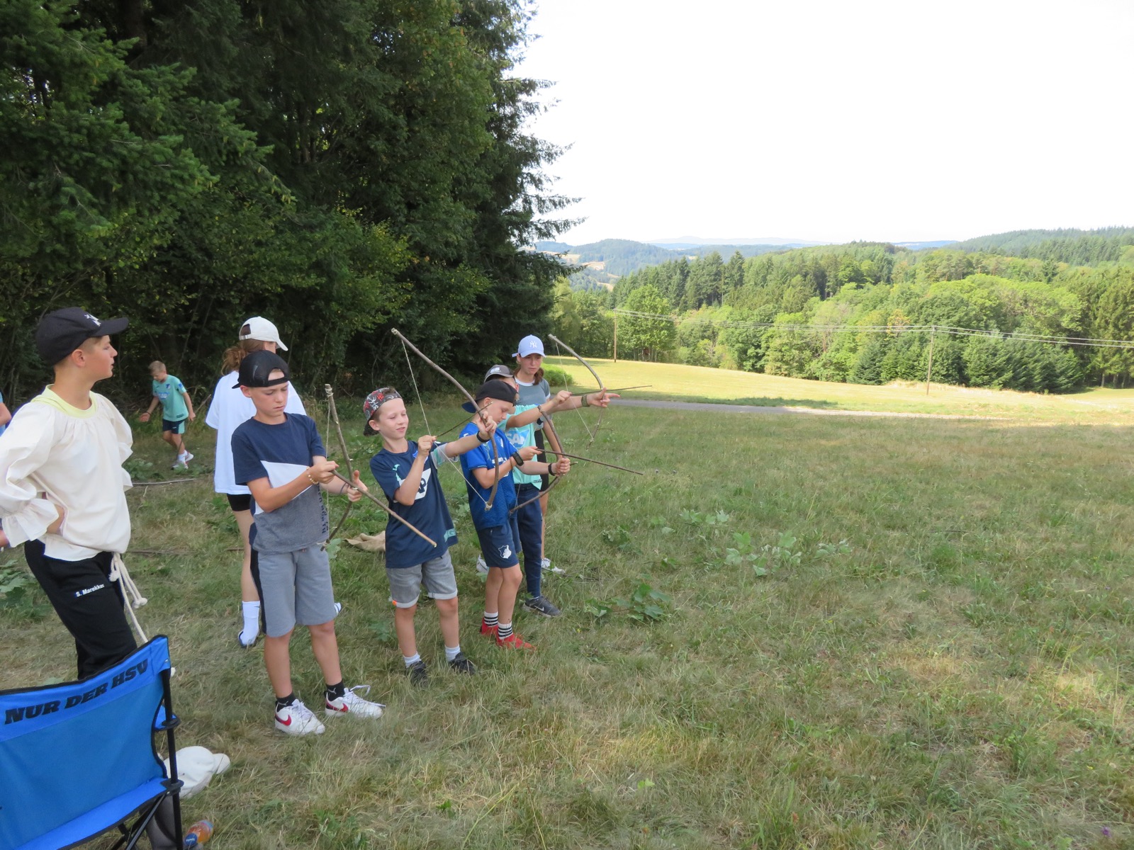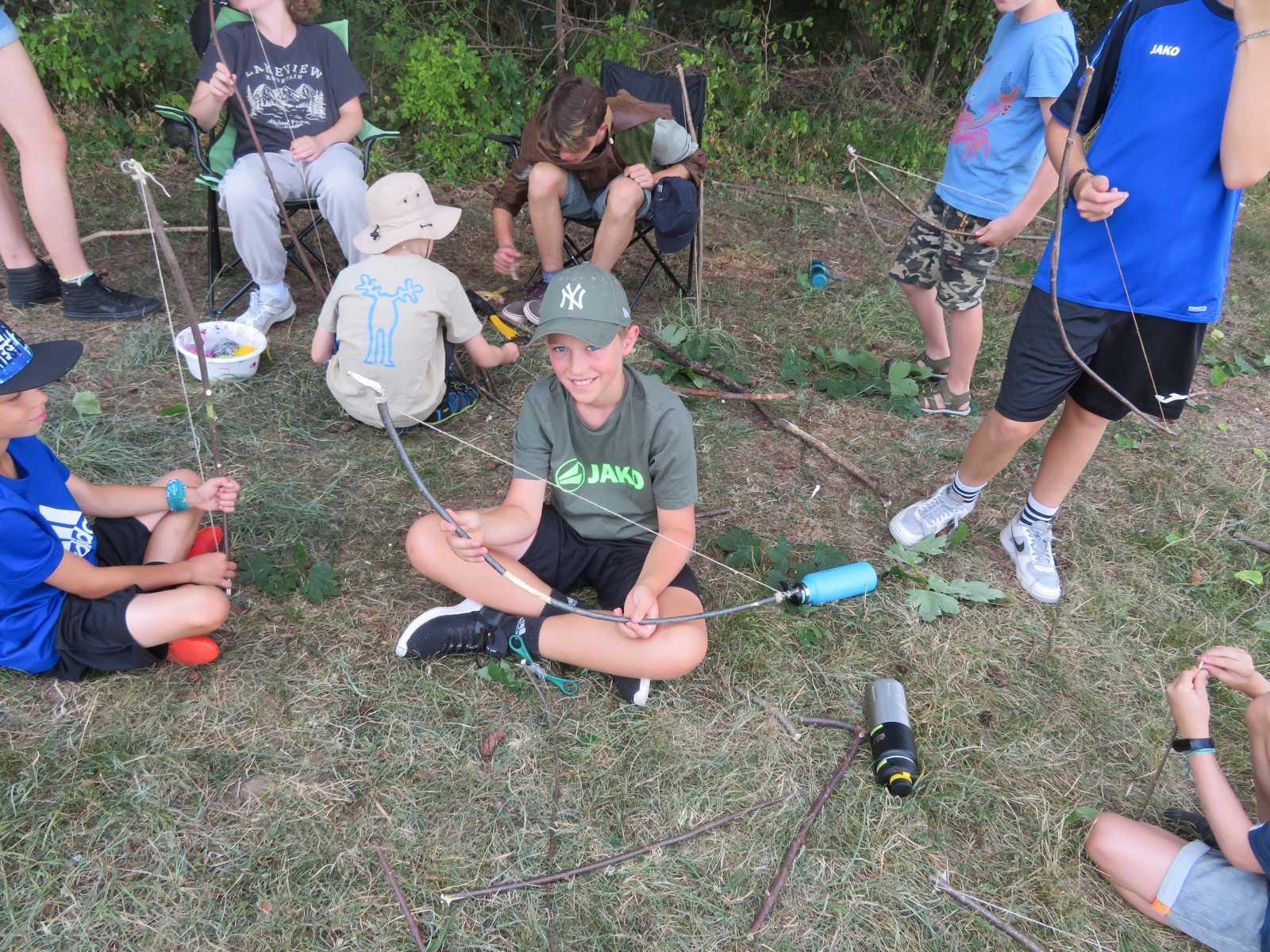 Am Morgen weckte uns dann Robin Hood und seine Freunde, die bei der Suche nach ihrem Schatz auf unserem Zeltplatz Rast machten. Die Kinder waren direkt Feuer und Flamme und boten ihnen ihre Hilfe an. Am Vormittag lehrten uns die Waldbewohner unter anderem Fährtenlesen, Bogenbauen und -schießen und brachten uns neue Lieder bei. Nach erfolgreicher Stärkung am Mittag mit leckeren Broten begann die Schatzsuche. An fünf Stationen duellierten sich jeweils zwei Gruppen in verschiedenen Wettbewerben (Lanzen stoßen, Parkour, Zielwerfen, Bogenschießen, Wikingerschach).