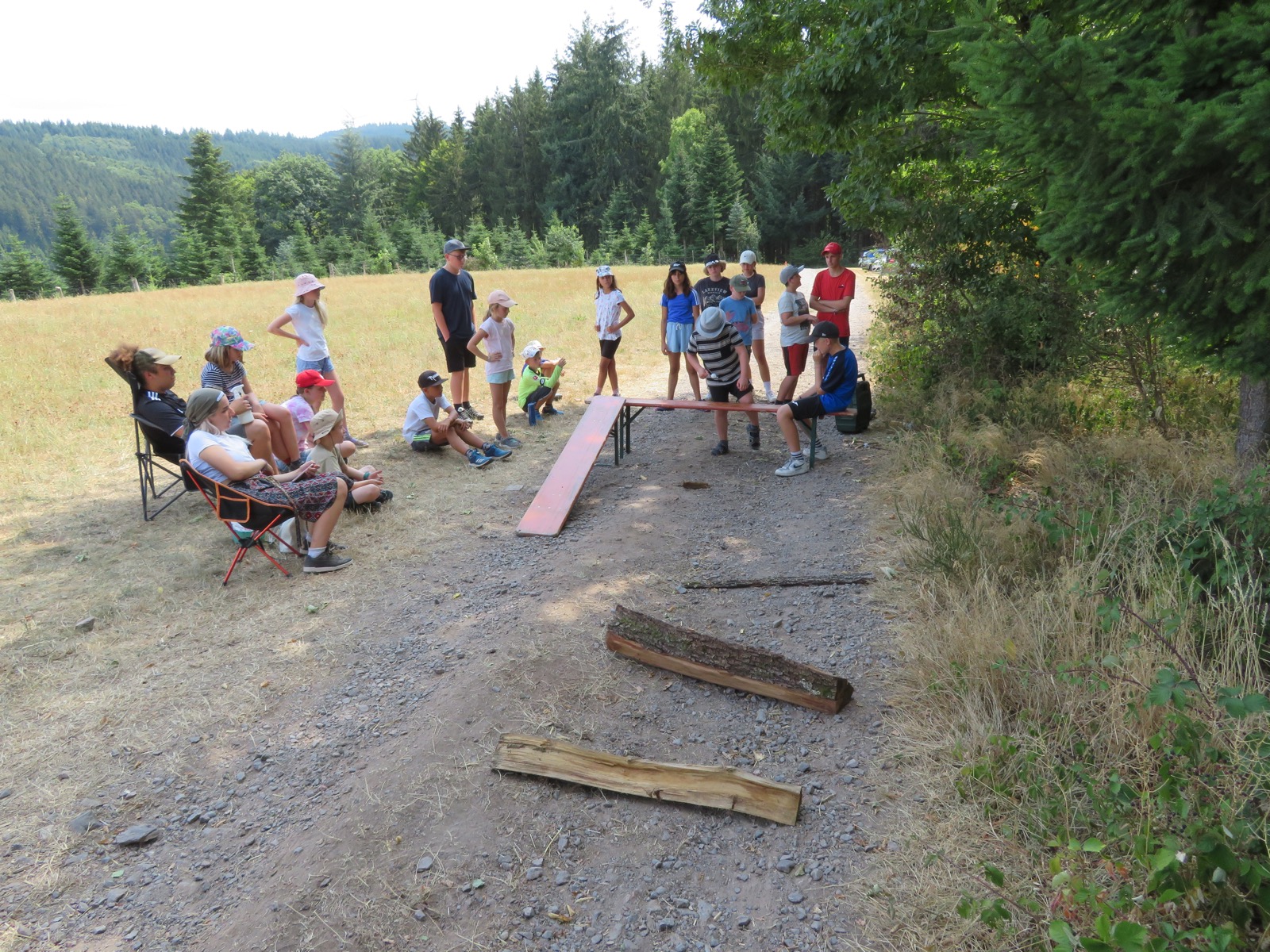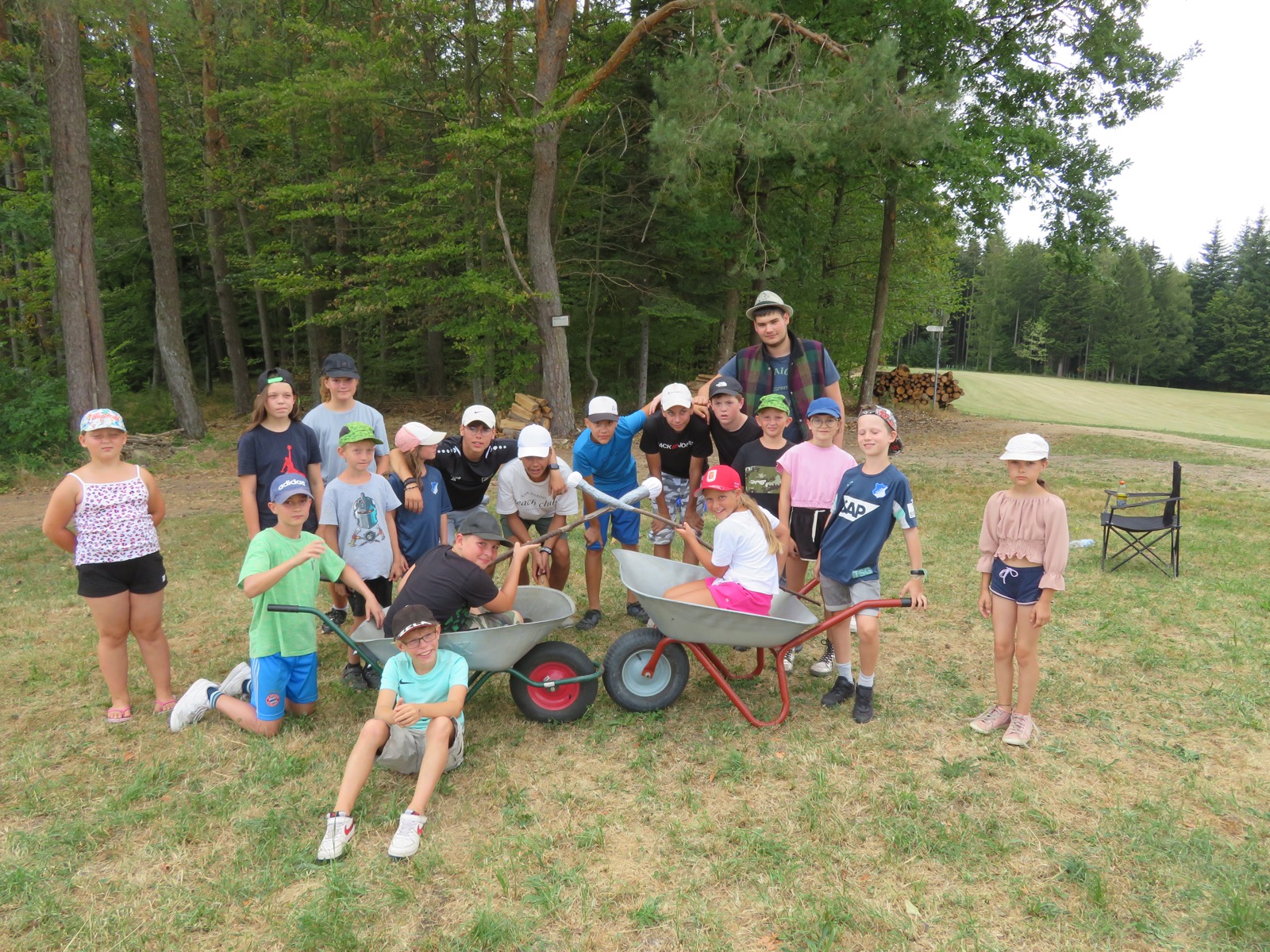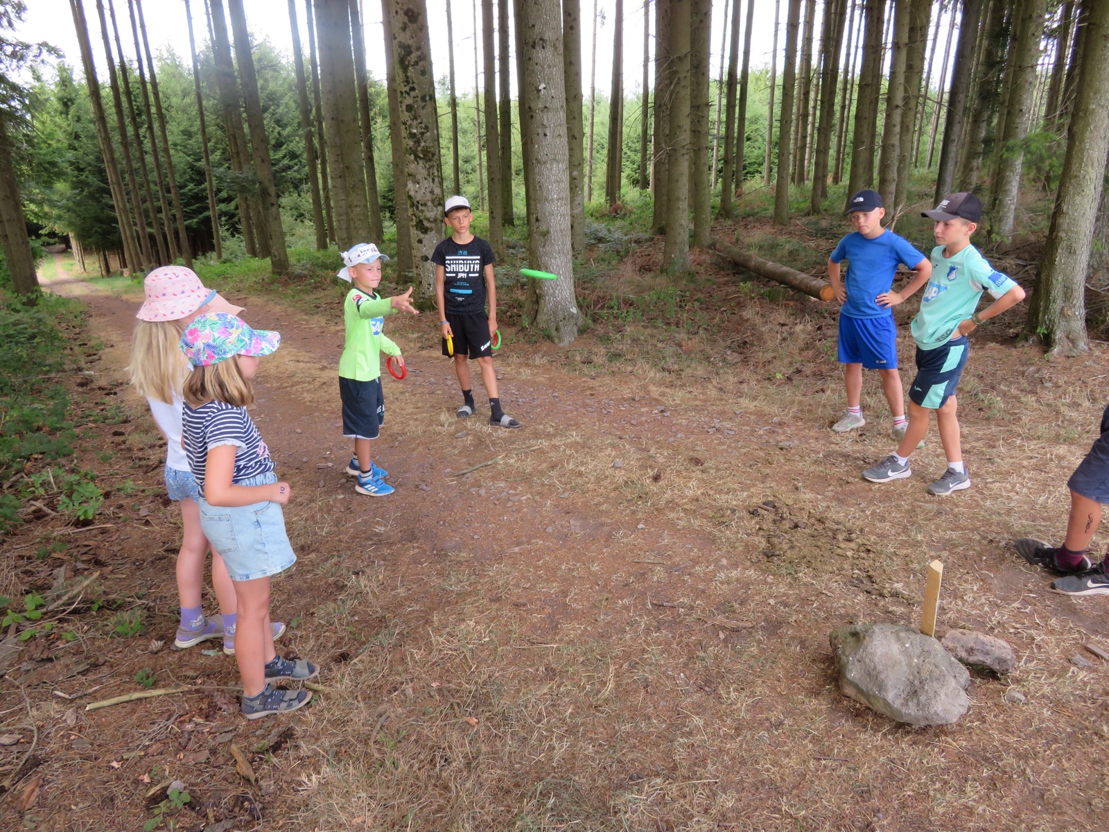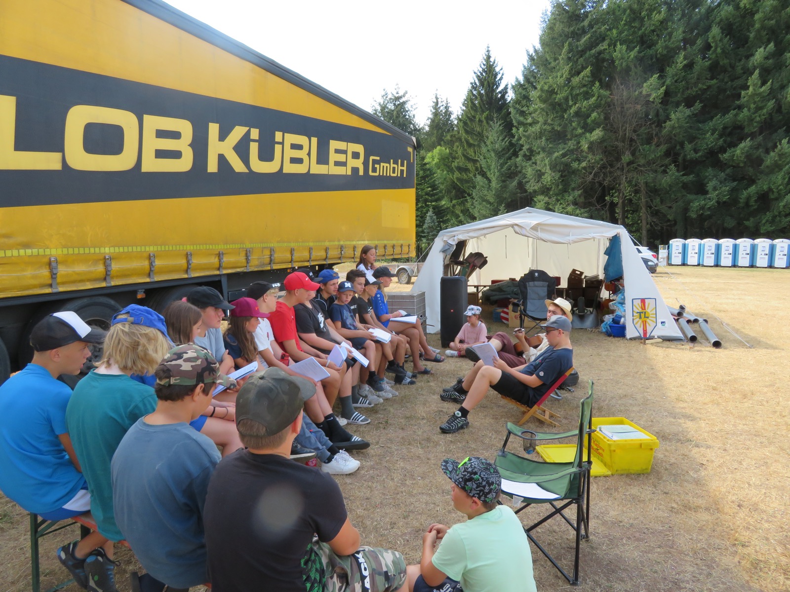 Am Morgen weckte uns dann Robin Hood und seine Freunde, die bei der Suche nach ihrem Schatz auf unserem Zeltplatz Rast machten. Die Kinder waren direkt Feuer und Flamme und boten ihnen ihre Hilfe an. Am Vormittag lehrten uns die Waldbewohner unter anderem Fährtenlesen, Bogenbauen und -schießen und brachten uns neue Lieder bei. Nach erfolgreicher Stärkung am Mittag mit leckeren Broten begann die Schatzsuche. An fünf Stationen duellierten sich jeweils zwei Gruppen in verschiedenen Wettbewerben (Lanzen stoßen, Parkour, Zielwerfen, Bogenschießen, Wikingerschach).