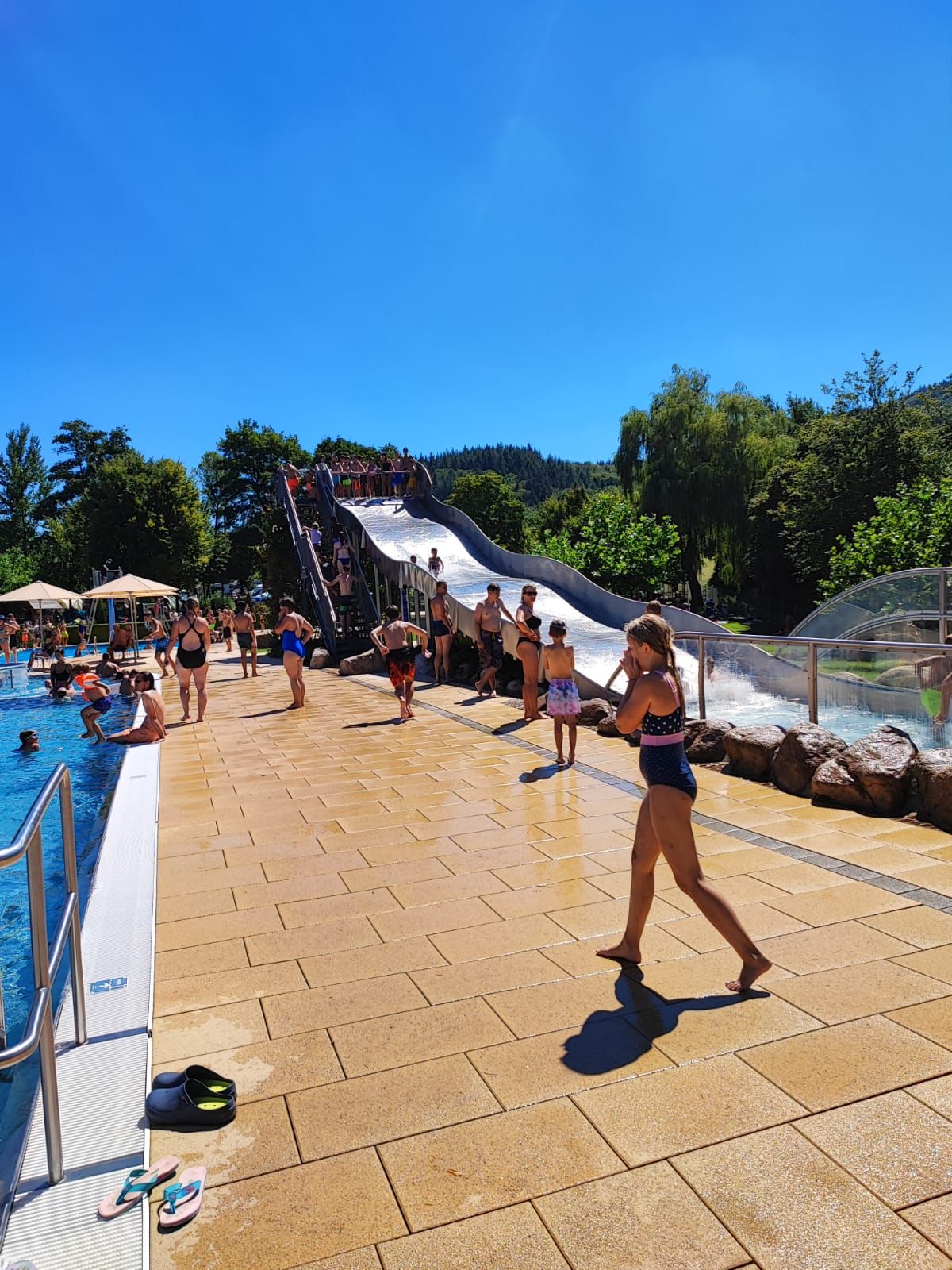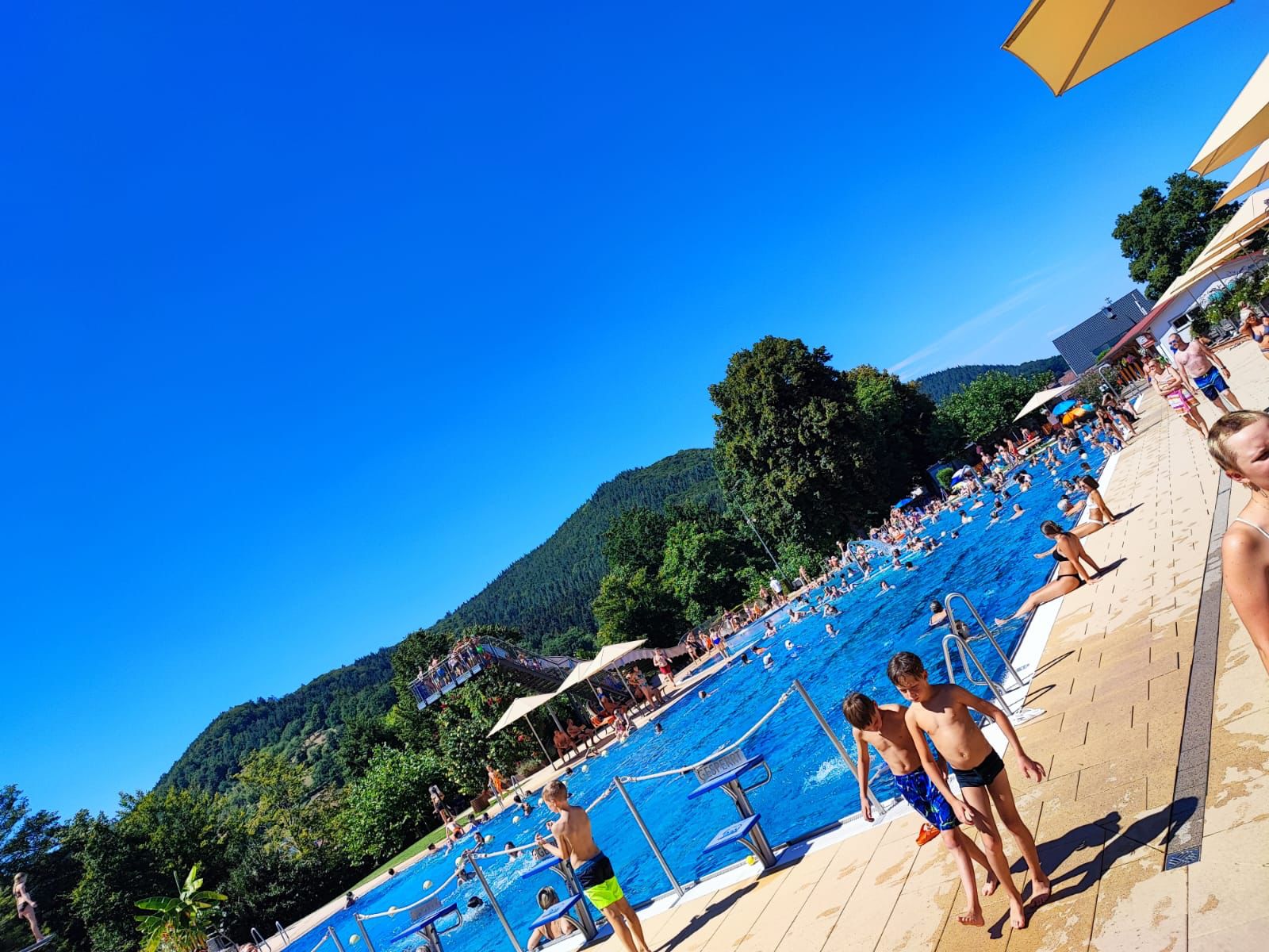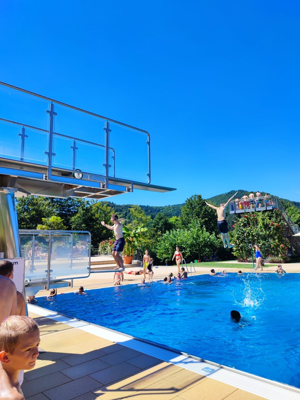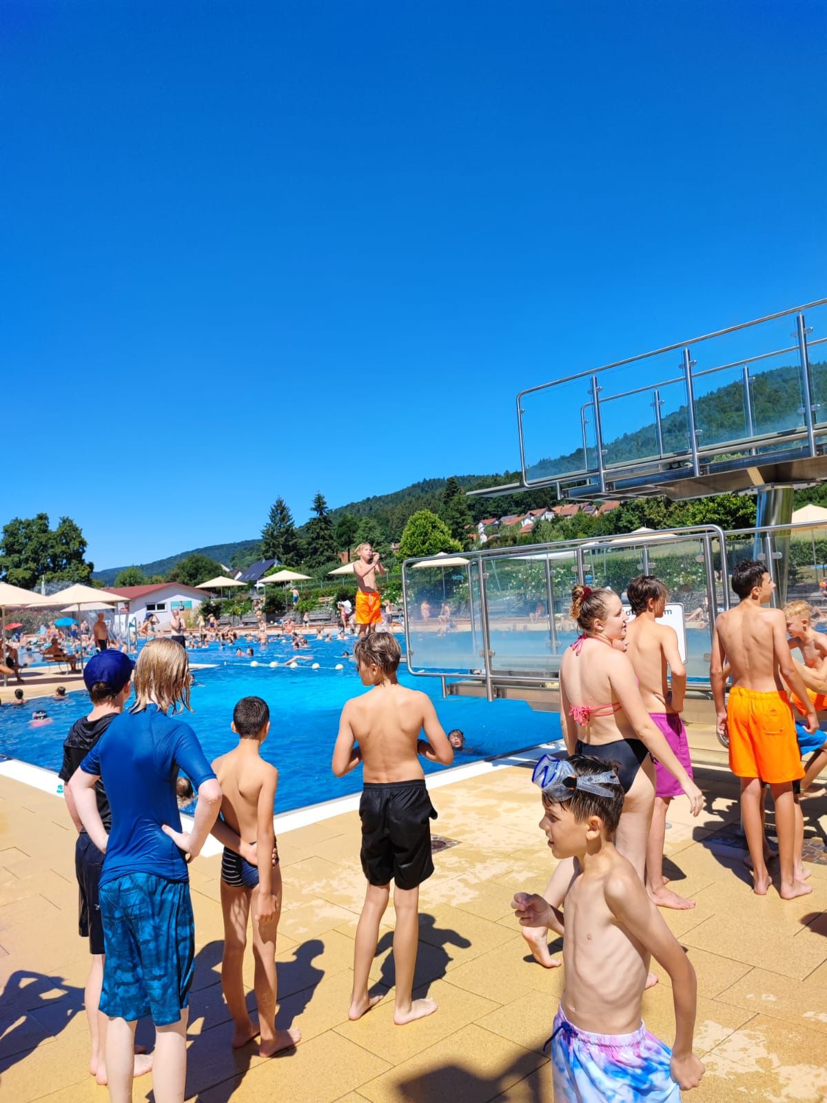 Am Donnerstag war der heißeste Tag seit langem. Bei knapp 38 Grad flohen wir ins Schwimmbad um uns abzukühlen. Mit einer tollen Rutsche, Sprungtürmen und verschiedenen Becken war der Schwimmbadtah definitiv ein Highlight für die Kinder.